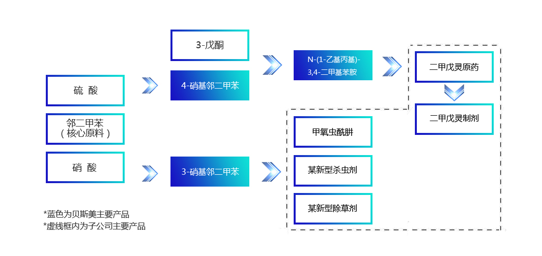 主要產品有4-硝基鄰⼆甲苯、N-(1-⼄基丙基)-3,4-⼆甲基苯胺等。