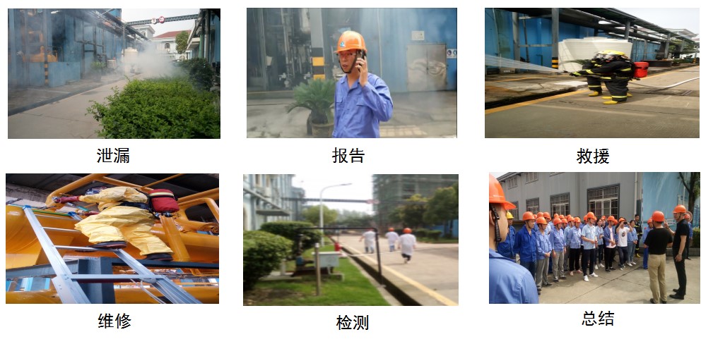 6月27日上午約9點(diǎn),中控室陳雙燕發(fā)現(xiàn)冷凍崗位的液氨儲槽有毒氣體探頭發(fā)生報(bào)警,遂通知陳欽宗趕往現(xiàn)場進(jìn)行檢查。陳欽宗在檢查后發(fā)現(xiàn),高壓儲氨器處發(fā)生大量泄漏,立即用對講機(jī)告知硝化操作工冷凍高壓儲氨器發(fā)生泄漏需停車后檢查自動噴淋設(shè)施是否正常開啟,并告知另外操作工吳麗忠前往中控室進(jìn)行一鍵停車操作;硝化操作工在接到冷凍泄漏情況的報(bào)告后,立即用對講機(jī)向工段長報(bào)告;工段長倪佰泉在接到報(bào)告后,告知硝化內(nèi)操人員進(jìn)行緊急停車操作后,并向現(xiàn)場指揮田園報(bào)告硝化停車原因;現(xiàn)場指揮田園經(jīng)現(xiàn)場確認(rèn),因氨泄漏無法及時(shí)控制,可能波及周邊人員,遂向總指揮報(bào)告,并請求啟動公司應(yīng)急預(yù)案;總指揮在接到事故報(bào)告后,宣布立即啟動應(yīng)急預(yù)案,現(xiàn)場指揮田園在得到啟動應(yīng)急預(yù)案的命令后,通知指揮部成員(副總指揮);然后總指揮、副總指揮和現(xiàn)場指揮立即分別對各職能小組下達(dá)命令。……經(jīng)過一系列的救援、維修、檢測等,最后把事故處理后的結(jié)果匯總到總指揮處。通過應(yīng)急預(yù)案的演練,檢查公司各應(yīng)急小組之間的協(xié)調(diào)能力,使得公司各應(yīng)急小組之間的配合進(jìn)一步熟練,使得應(yīng)對突發(fā)狀況的能力進(jìn)一步提高。
